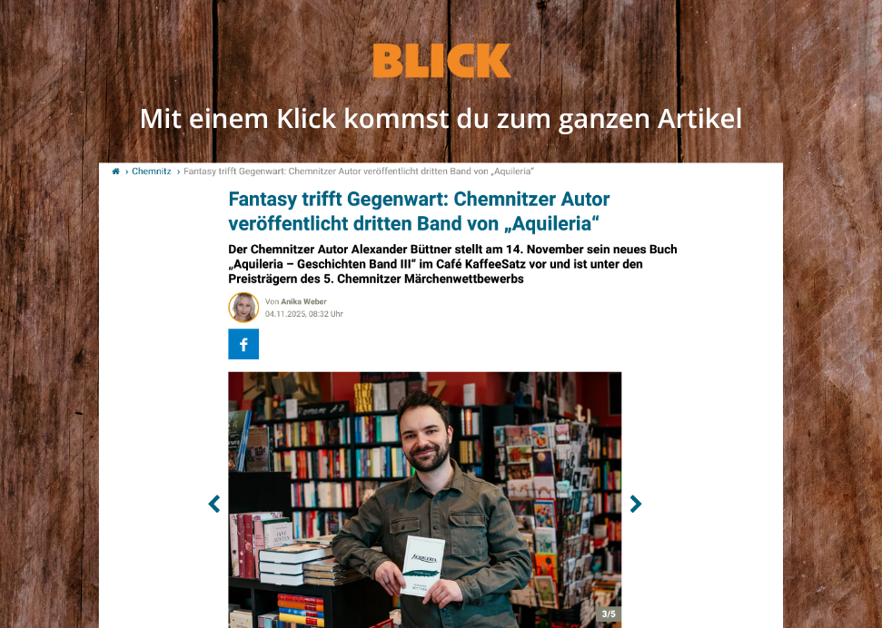 • BLICK am 04.11.2025: „Fantasy trifft Gegenwart: Chemnitzer Autor veröffentlicht dritten Band von Aquileria“ 5. November 2025
